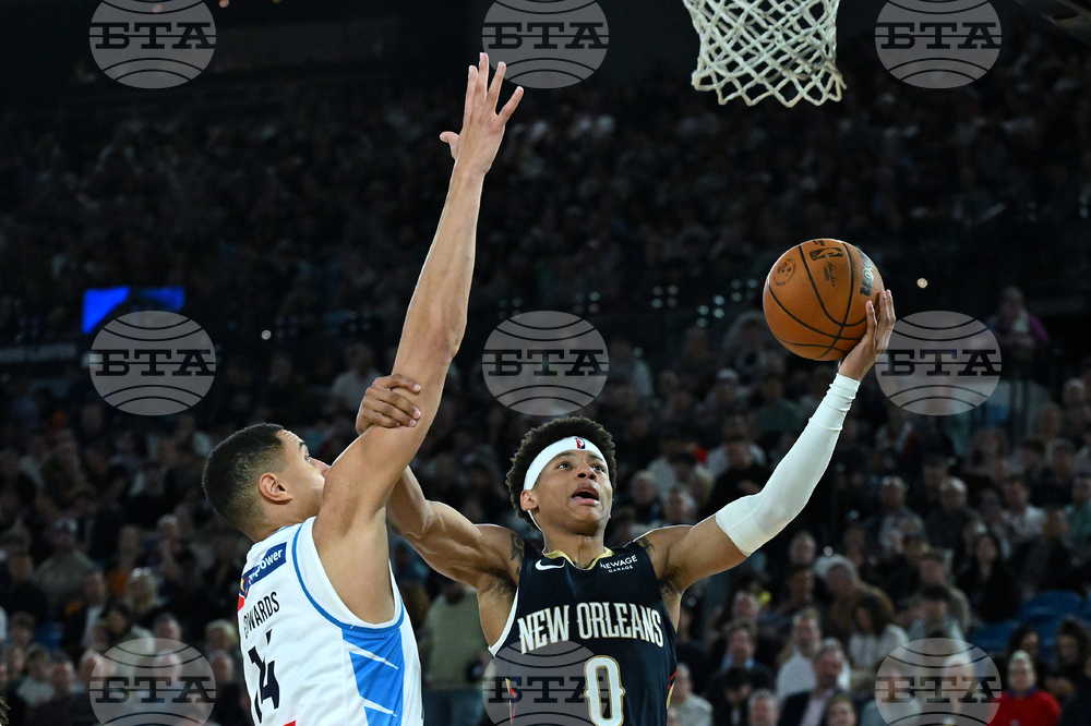 Trey Alexander of the New Orleans Pelicans, left, goes around Milton Doyle of Melbourne United during their NBAxNBL Series exhibition basketball game in Melbourne, Australia, on Friday, Oct. 3, 2025. (James Ross/AAP Image via AP) /AAP Image via AP)
