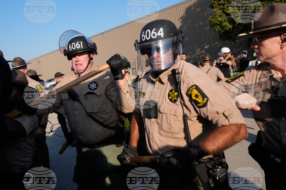 Law enforcement hold back protesters near an Immigration and Customs Enforcement facility in Broadview, Ill., Friday, Oct. 3, 2025. (AP Photo/Erin Hooley))