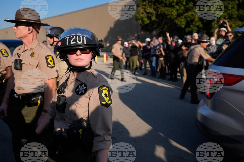 Protesters gather near an Immigration and Customs Enforcement facility in Broadview, Ill., Friday, Oct. 3, 2025. (AP Photo/Erin Hooley)