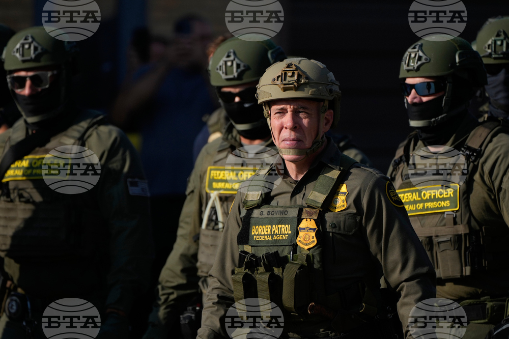Greg Bovino, the chief patrol agent for the U.S. Border Patrol El Centro sector, center, stands with federal immigration agents near an Immigration and Customs Enforcement facility in Broadview, Ill., Friday, Oct. 3, 2025. (AP Photo/Erin Hooley)