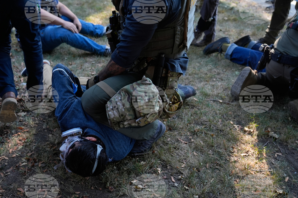Law enforcement detains a protester near an Immigration and Customs Enforcement facility in Broadview, Ill., Friday, Oct. 3, 2025. (AP Photo/Erin Hooley)