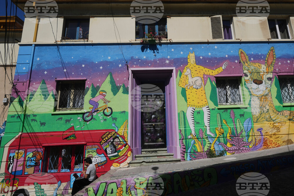 People walk past La Casa del Puerto cultural hostel during the FIFA U-20 World Cup in Valparaiso, Chile, Tuesday, Sept. 30, 2025. (AP Photo/Andre Penner)