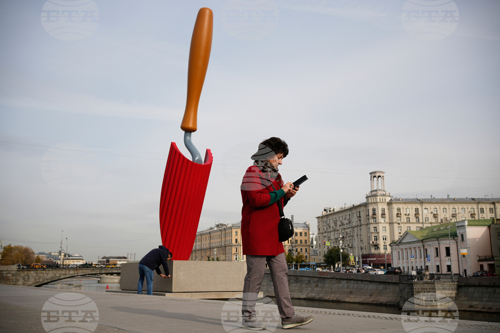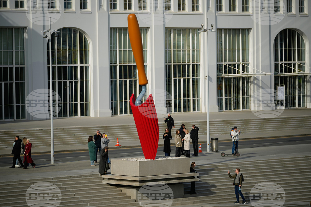 People walk next to Plantoir, a sculpture of a giant garden trowel by American artists Claes Oldenburg and Coosjie Van Bruggen installed outside of the GES-2 House of Culture in Moscow, Russia, on Friday, Oct. 3, 2025. (AP Photo/Pavel Bednyakov)