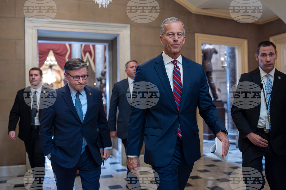 Speaker of the House Mike Johnson, R-La., left, and Senate Majority Leader John Thune, R-S.D., return to their offices after meeting with reporters on the third day of the government shutdown, at the Capitol in Washington, Friday, Oct. 3, 2025. (AP Photo/J. Scott Applewhite)