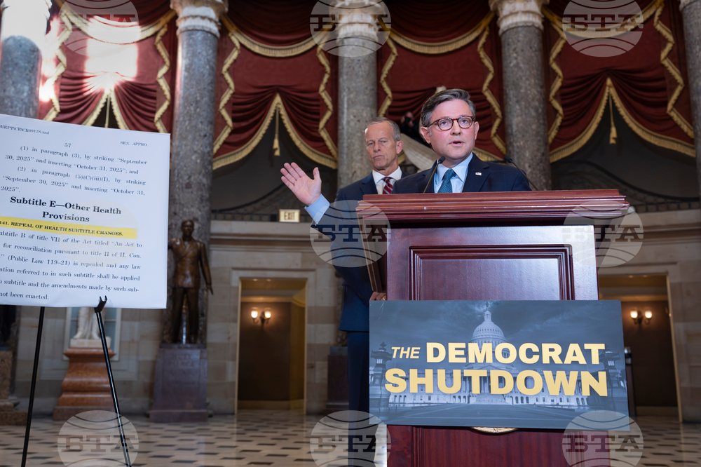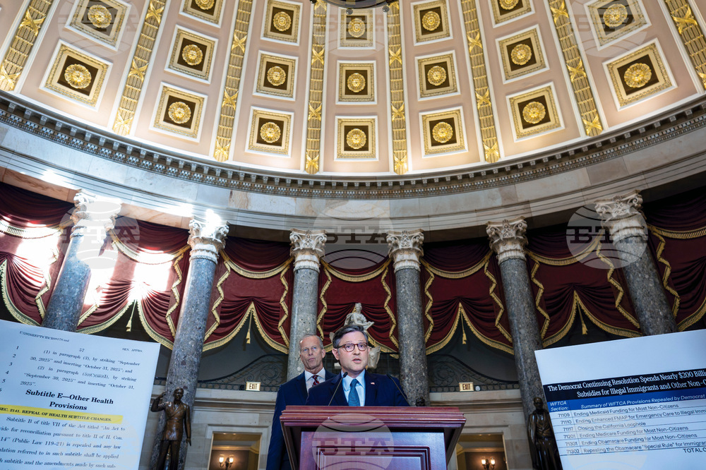 Senate Majority Leader John Thune, R-S.D., center, and Speaker of the House Mike Johnson, R-La., speak with reporters in Statuary Hall on the third day of the government shutdown, at the Capitol in Washington, Friday, Oct. 3, 2025. (AP Photo/J. Scott Applewhite)