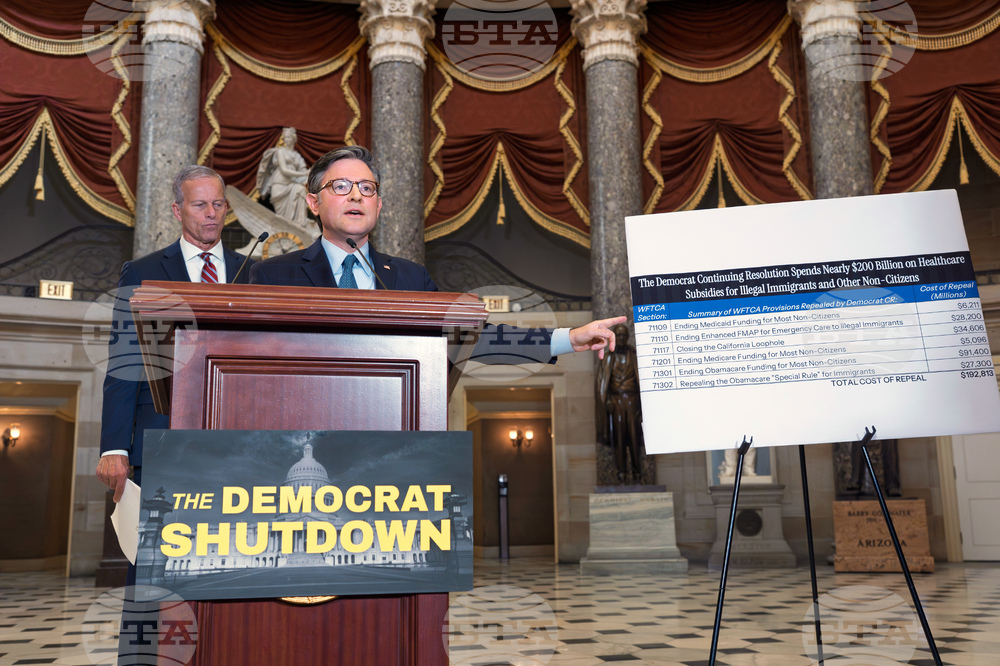 Senate Majority Leader John Thune, R-S.D., center, and Speaker of the House Mike Johnson, R-La., and right, talk with reporters in Statuary Hall on the third day of the government shutdown, at the Capitol in Washington, Friday, Oct. 3, 2025. (AP Photo/J. Scott Applewhite)