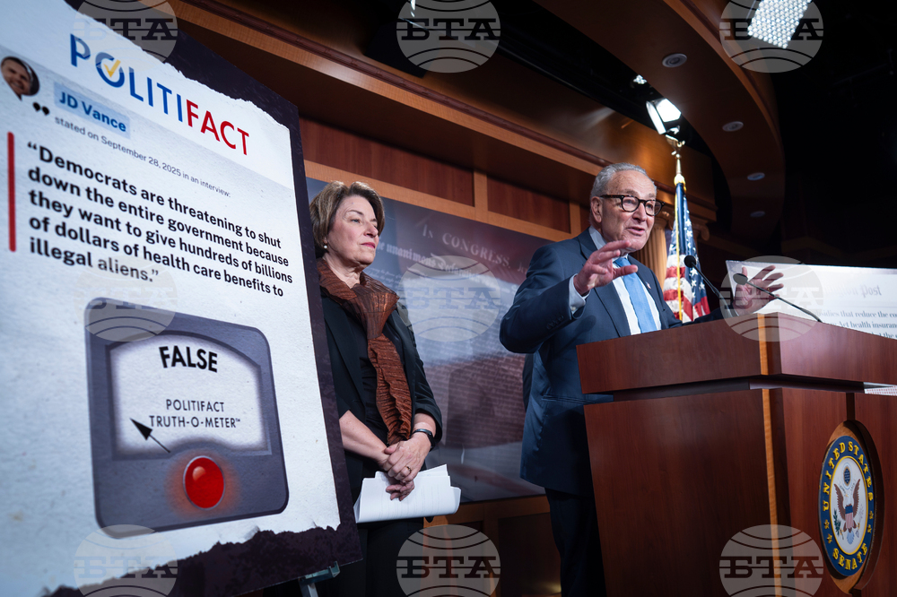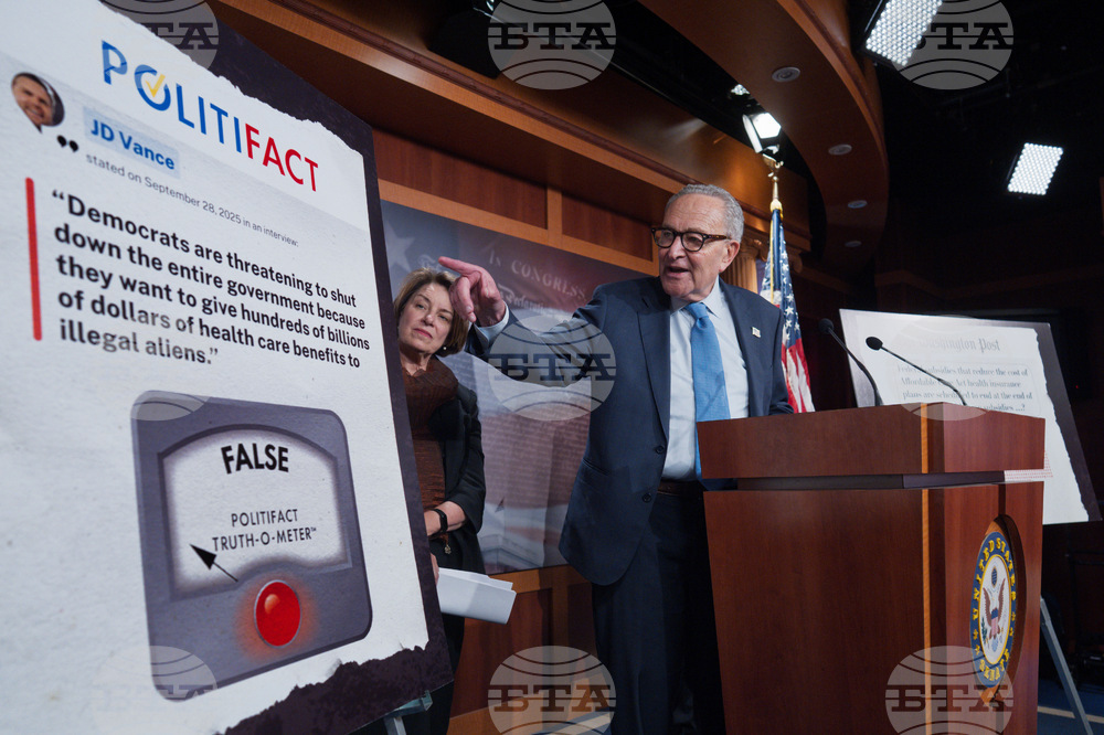 Senate Minority Leader Chuck Schumer, D-N.Y., joined by Sen. Amy Klobuchar, D-Minn., left, holds a news conference on the third day of the government shutdown, at the Capitol in Washington, Friday, Oct. 3, 2025. (AP Photo/J. Scott Applewhite)