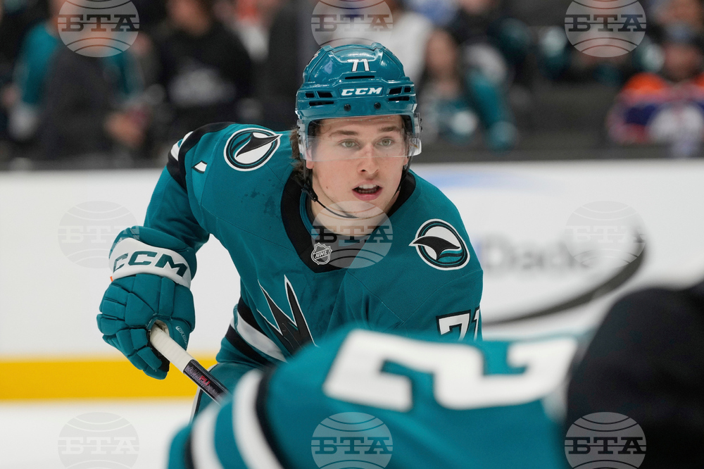 FILE - San Jose Sharks center Macklin Celebrini gets ready during a face off in an NHL hockey game against the Edmonton Oilers in San Jose, Calif., April 16, 2025. (AP Photo/Jeff Chiu, File)