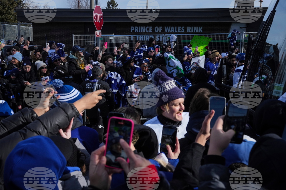 FILE - Toronto Maple Leafs William Nylander greets fans as players make their way to a bus after an outdoor practice at Toronto's Prince of Wales rink, Jan. 27, 2025. (Chris Young/The Canadian Press via AP, File)