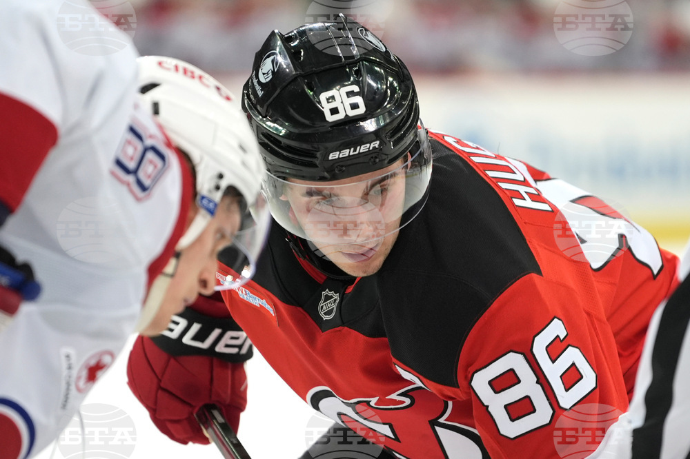 FILE - New Jersey Devils' Jack Hughes prepares for a face off during an NHL hockey game against the Montréal Canadiens, Nov. 7, 2024, in Newark, New Jersey. (AP Photo/Pamela Smith, File)