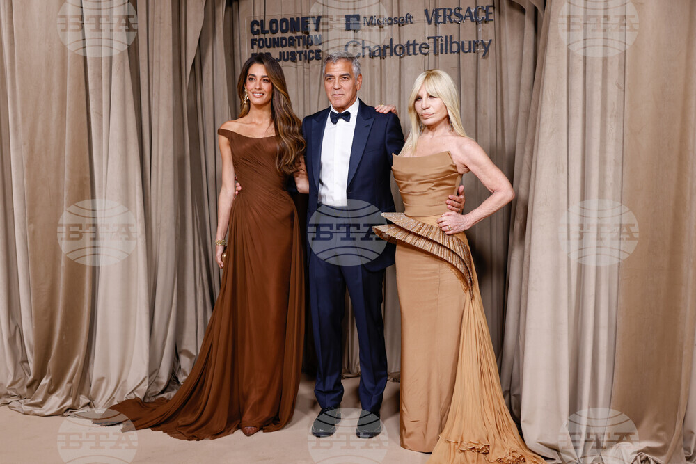 Amal Clooney, from left, George Clooney, and Donatella Versace pose for photographers upon arrival at The Albies on Friday, Oct. 3, 2025, in London. (Photo by Millie Turner/Invision/AP)
