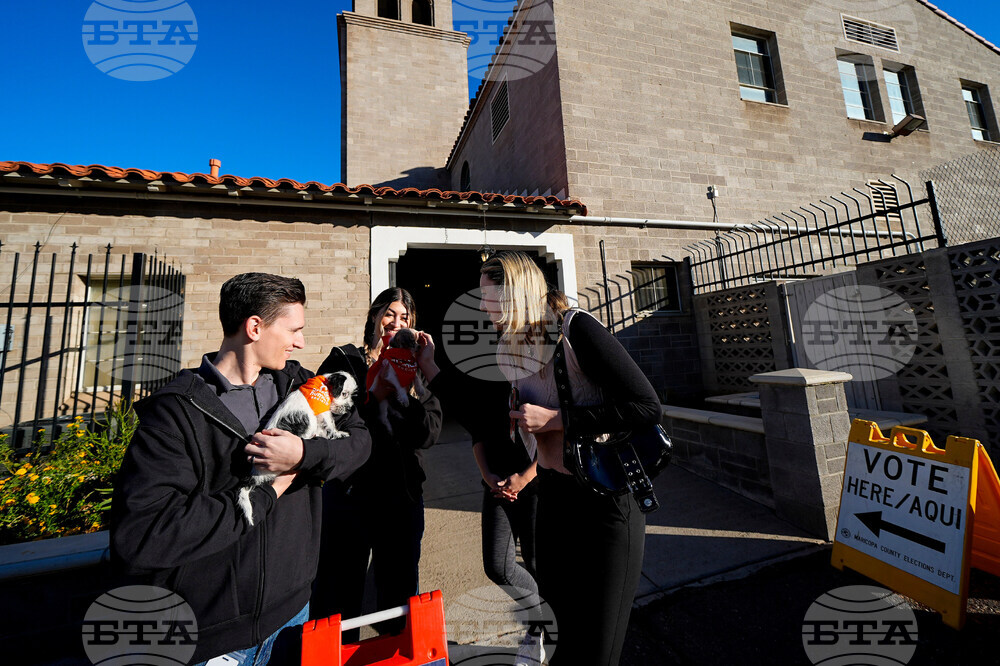 FILE - Joe Casados, left, holds a dog named Daphne, and Samantha Sasso, holds Carly, as they show the dogs to voters outside the Faith Lutheran Church to ease voter anxiety, Tuesday, Nov. 5, 2024, in Phoenix, Ariz. (AP Photo/Julio Cortez, File)