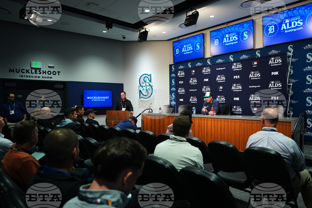 Seattle Mariners manager Dan Wilson speaks during a news conference, Friday, Oct. 3, 2025, in Seattle, the day before Game 1 of baseball's American League Division Series against the Detroit Tigers. (AP Photo/Lindsey Wasson)