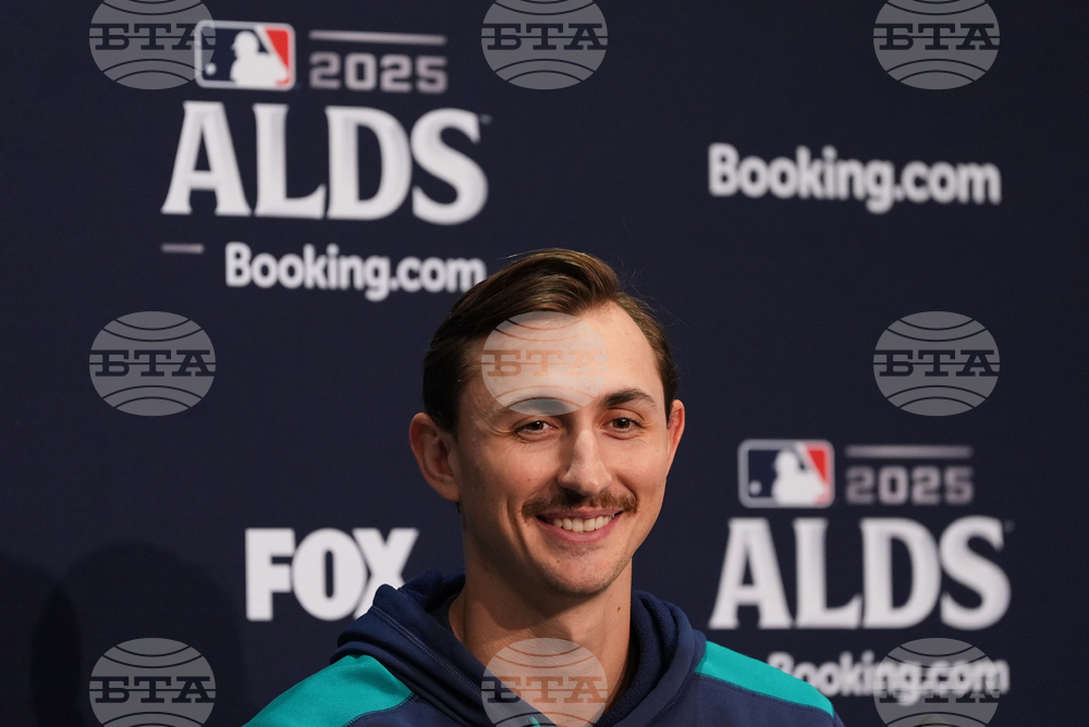 Seattle Mariners starting pitcher George Kirby smiles during a news conference, Friday, Oct. 3, 2025, in Seattle, the day before Game 1 of baseball's American League Division Series against the Detroit Tigers. (AP Photo/Lindsey Wasson)
