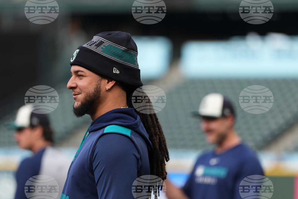 Seattle Mariners players, including Seattle Mariners second baseman Jorge Polanco, third baseman Eugenio Suárez, right fielder Victor Robles and shortstop J.P. Crawford take batting practice, Friday, Oct. 3, 2025, in Seattle, the day before Game 1 of baseball's American League Division Series against the Detroit Tigers. (AP Photo/Lindsey Wasson)