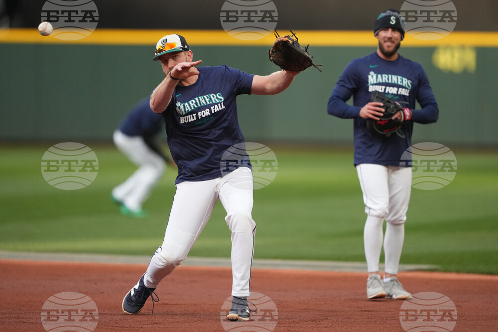 Seattle Mariners' Luke Raley makes a throw in an infield drill during batting practice Friday, Oct. 3, 2025, in Seattle, the day before Game 1 of baseball's American League Division Series against the Detroit Tigers. (AP Photo/Lindsey Wasson)