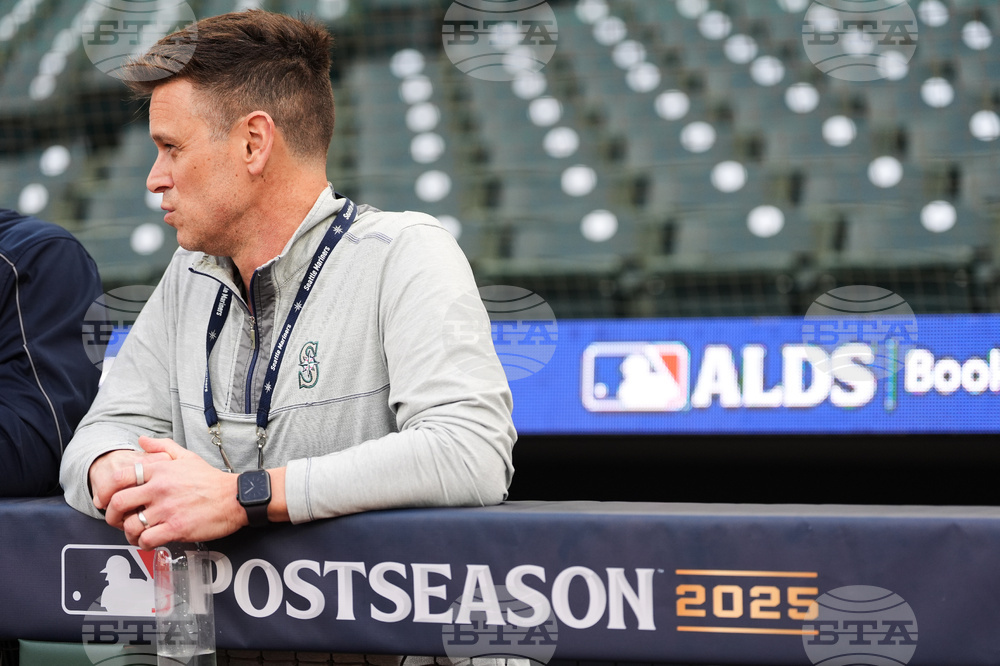 Seattle Mariners president of baseball operations Jerry Dipoto watches workouts from the dugout railing, Friday, Oct. 3, 2025, in Seattle, the day before Game 1 of baseball's American League Division Series against the Detroit Tigers. (AP Photo/Lindsey Wasson)