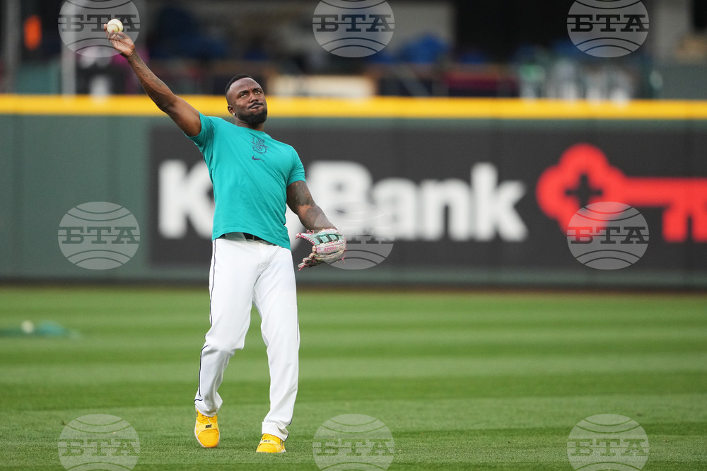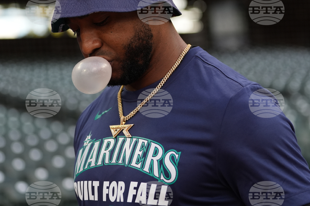 Seattle Mariners right fielder Victor Robles blows a bubble during batting practice, Friday, Oct. 3, 2025, in Seattle, the day before Game 1 of baseball's American League Division Series against the Detroit Tigers. (AP Photo/Lindsey Wasson)