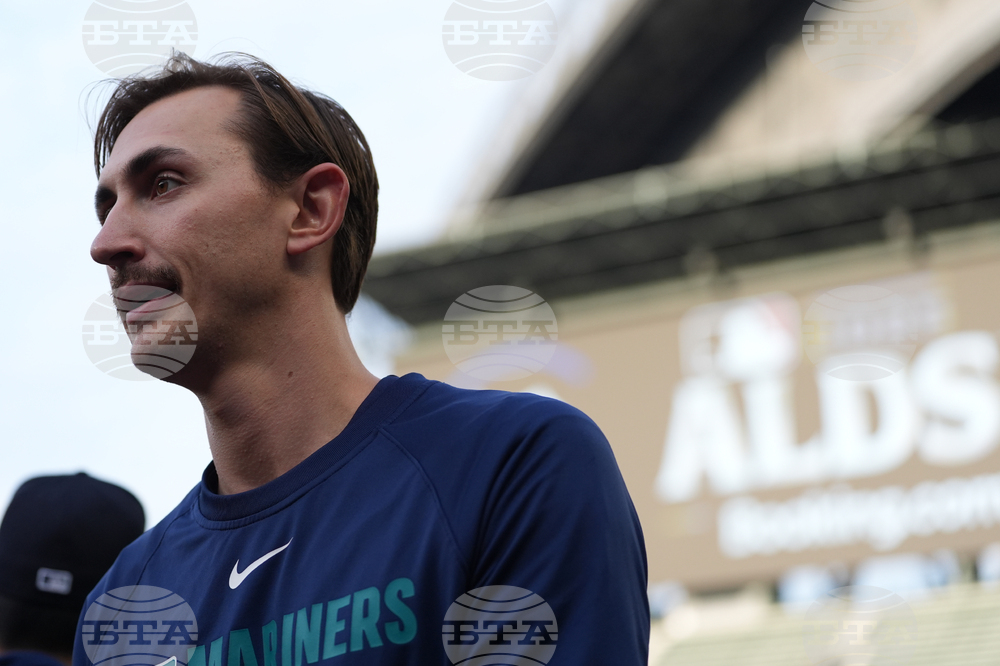 Seattle Mariners pitcher George Kirby warms up in the outfield during workouts, Friday, Oct. 3, 2025, in Seattle, the day before Game 1 of baseball's American League Division Series against the Detroit Tigers. (AP Photo/Lindsey Wasson)