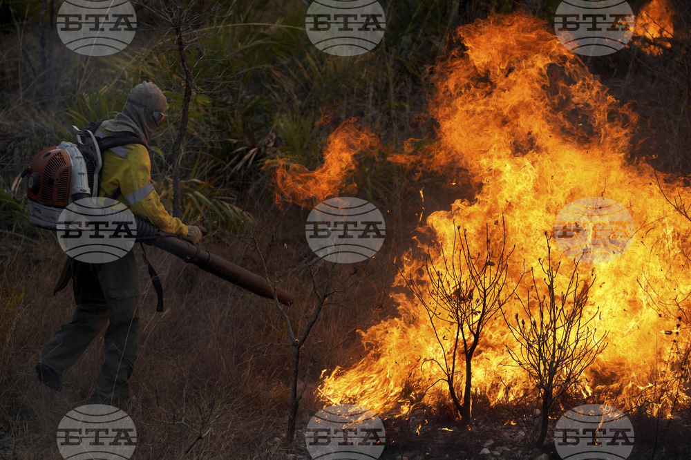 Firefighters from the Chico Mendes Institute work to contain a forest fire and prevent it from reaching Chapada dos Veadeiros National Park, in the municipality of Cavalcante, northern Goiás state, Brazil, Friday, Oct. 3, 2025. (AP Photo/Eraldo Peres)