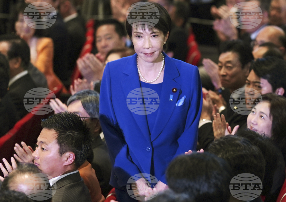 Former Economic Security Minister Sanae Takaichi, center, stands as Takaichi was chosen to a new leader of Japan’s ruling Liberal Democratic Party during the party's leadership election in Tokyo, Japan, Saturday, Oct. 4, 2025. (Kyodo News via AP)