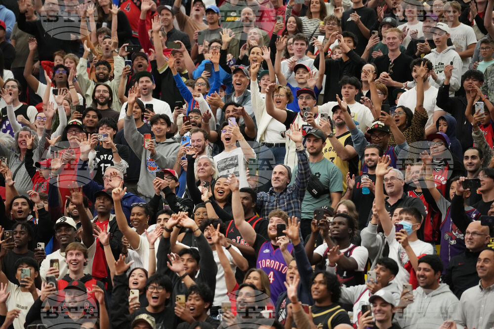 Toronto Raptors fans welcome the players to the floor during an NBA basketball training camp in Calgary, Alberta, Friday, Oct. 3, 2025. (Todd Korol/The Canadian Press via AP)