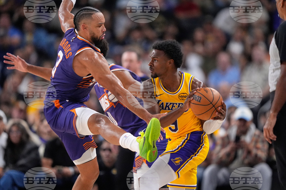 Los Angeles Lakers guard Bronny James, right, tries to pass while under pressure from Phoenix Suns forward Dillon Brooks during the second half of an NBA preseason basketball game Friday, Oct. 3, 2025, in Palm Desert, Calif. (AP Photo/Mark J. Terrill)