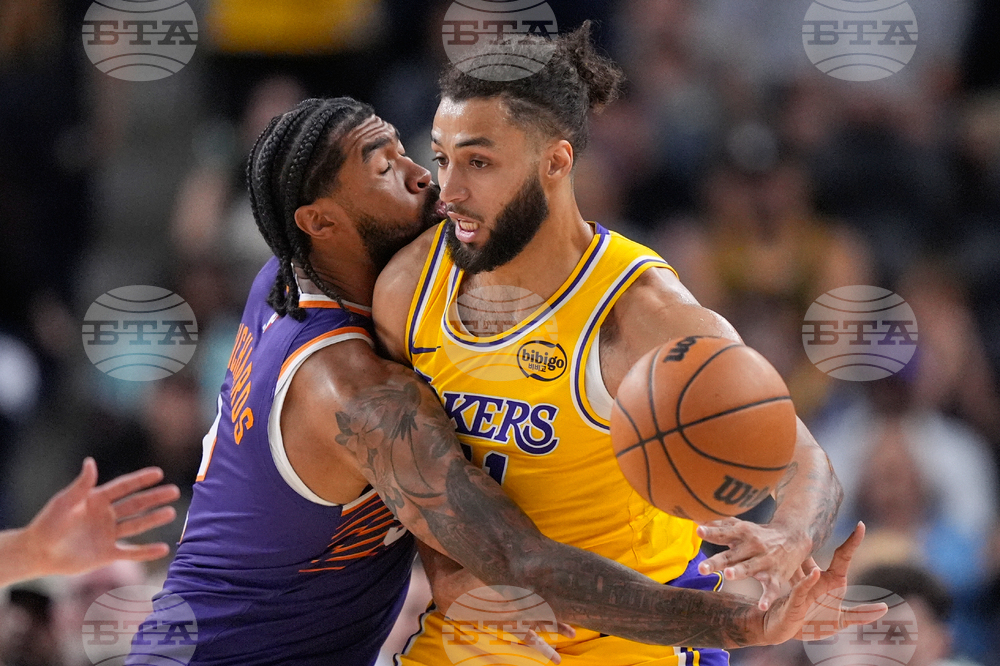 Los Angeles Lakers forward Rui Hachimura, left, tries to pass while under pressure from Phoenix Suns guard Collin Gillespie during the second half of an NBA preseason basketball game Friday, Oct. 3, 2025, in Palm Desert, Calif. (AP Photo/Mark J. Terrill)