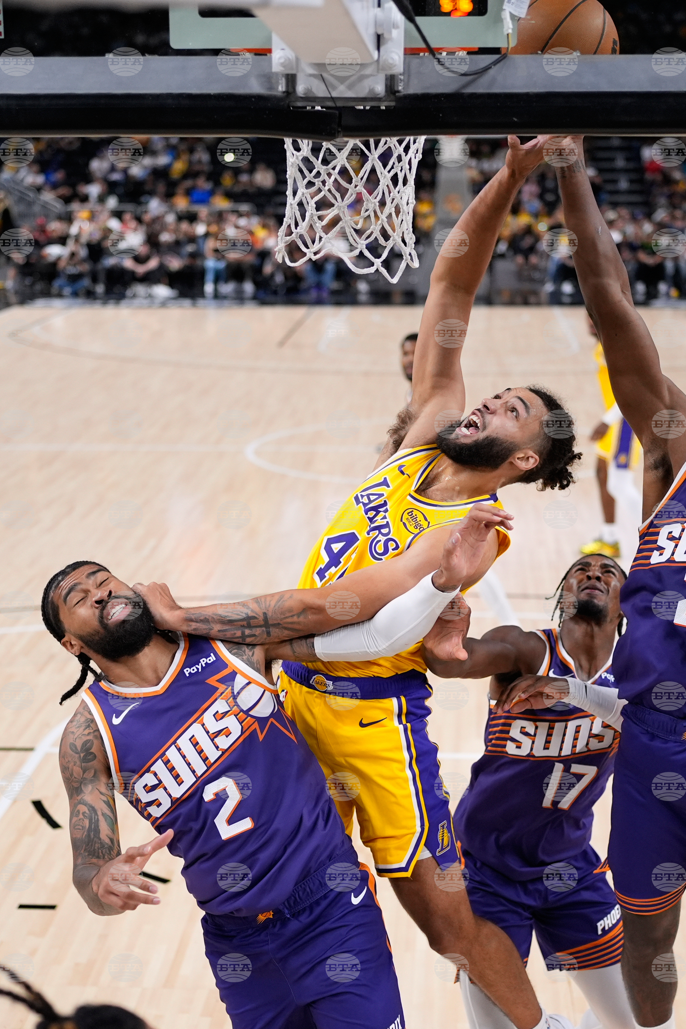 Los Angeles Lakers center Kylor Kelley, left, goes after a rebound along with Phoenix Suns forward Royce O'Neale, center, and center Oso Ighodaro during the first half of an NBA preseason basketball game Friday, Oct. 3, 2025, in Palm Desert, Calif. (AP Photo/Mark J. Terrill)