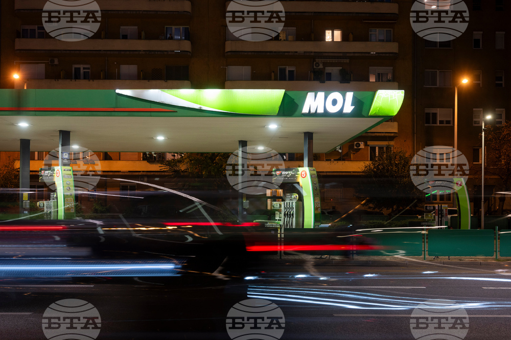 A car drives by a of MOL gas station in downtown Budapest, Hungary, on Sept. 27, 2025. (AP Photo/Denes Erdos)