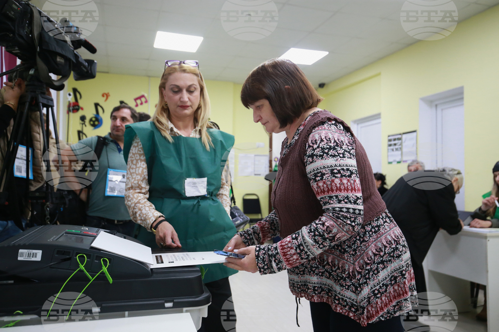 A woman gets her ballot to vote at a polling station during the municipal elections in Tbilisi, Georgia, on Saturday, Oct. 4, 2025. (AP Photo/Zurab Tsertsvadze)