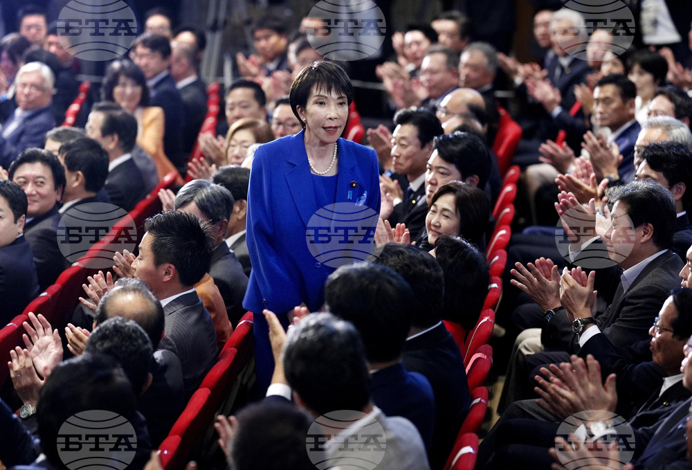 Former Economic Security Minister Sanae Takaichi, center, stands as Takaichi was chosen to a new leader of Japan’s ruling Liberal Democratic Party during the party's leadership election in Tokyo, Japan, Saturday, Oct. 4, 2025. (Kyodo News via AP)