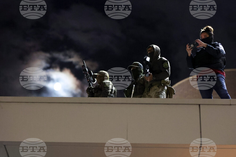 Federal agents stand on the roof as people protest outside a U.S. Immigration and Customs Enforcement facility in Portland, Oregon, Friday, Oct. 3, 2025. (AP Photo/Amanda Loman)