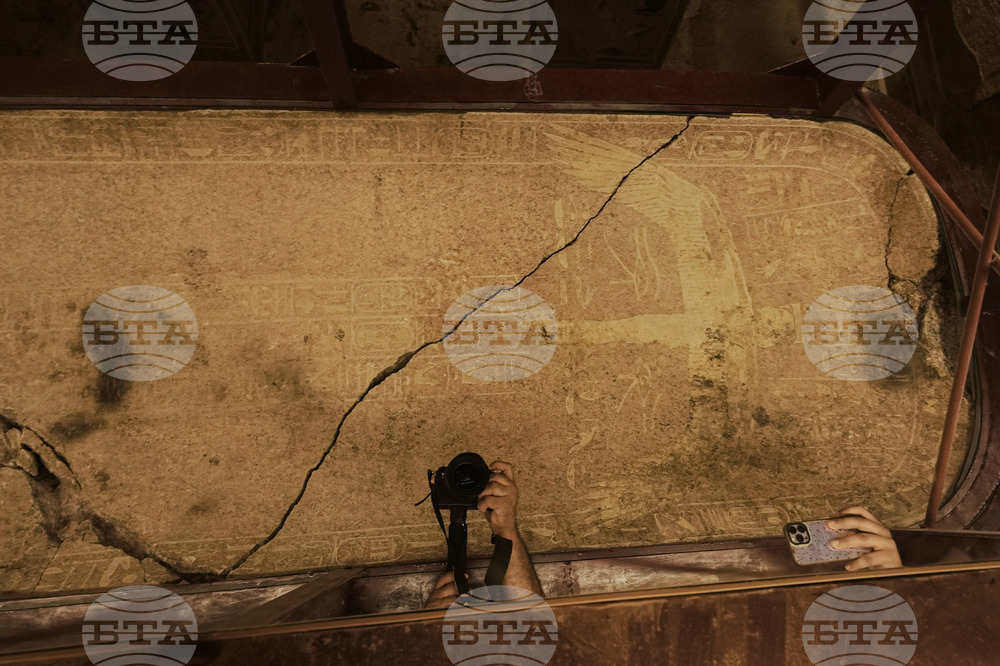 Photographers film in the tomb of Amenhotep III, who ruled ancient Egypt between 1390 B.C. and 1350 B.C., in the Valley of Kings in the southern city of Luxor, Egypt, Saturday, Oct. 4, 2025, as it opened to visitors for the first time in more than two decades. (AP Photo/Amr Nabil)