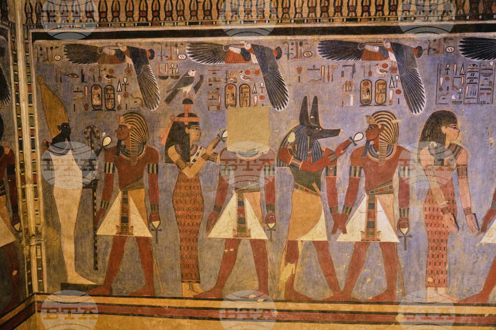Guards of the tomb of Amenhotep III, who ruled ancient Egypt between 1390 B.C. and 1350 B.C., stand in the Valley of Kings in the southern city of Luxor, Egypt, Saturday, Oct. 4, 2025, as it opened to visitors for the first time in more than two decades. (AP Photo/Amr Nabil)