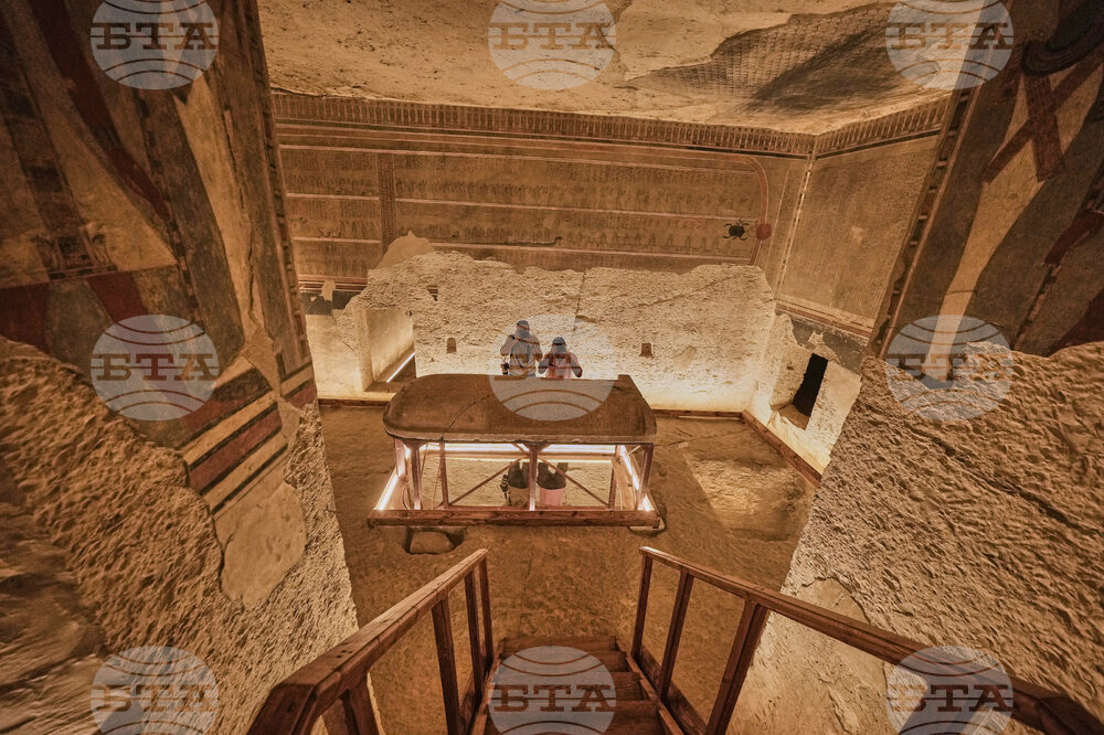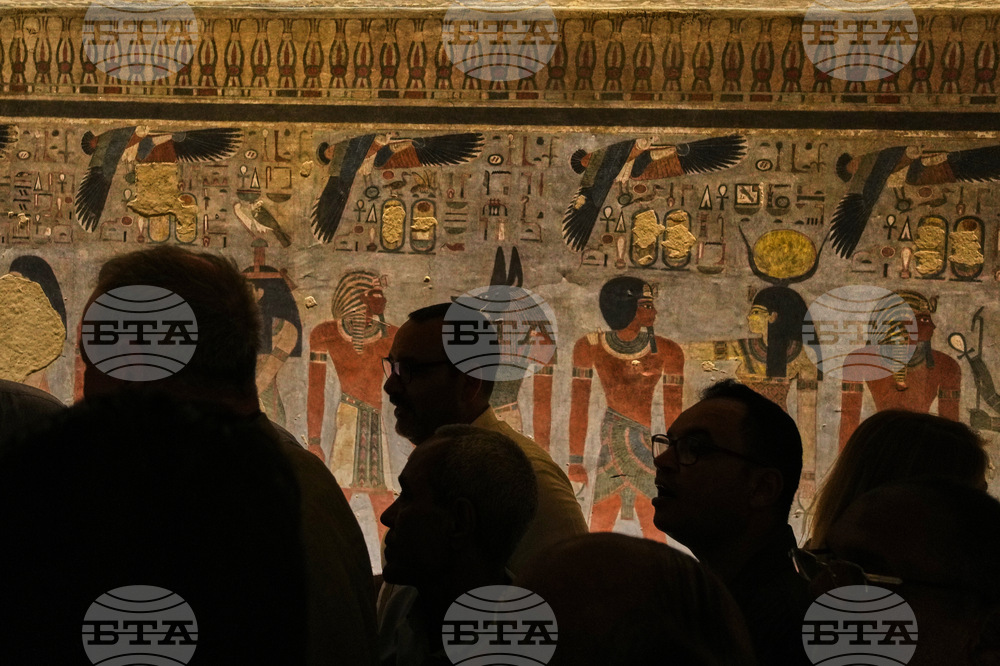 Visitors look at the tomb of Amenhotep III, who ruled ancient Egypt between 1390 B.C. and 1350 B.C., in the Valley of Kings in the southern city of Luxor, Egypt, Saturday, Oct. 4, 2025, as it opened to visitors for the first time in more than two decades. (AP Photo/Amr Nabil)