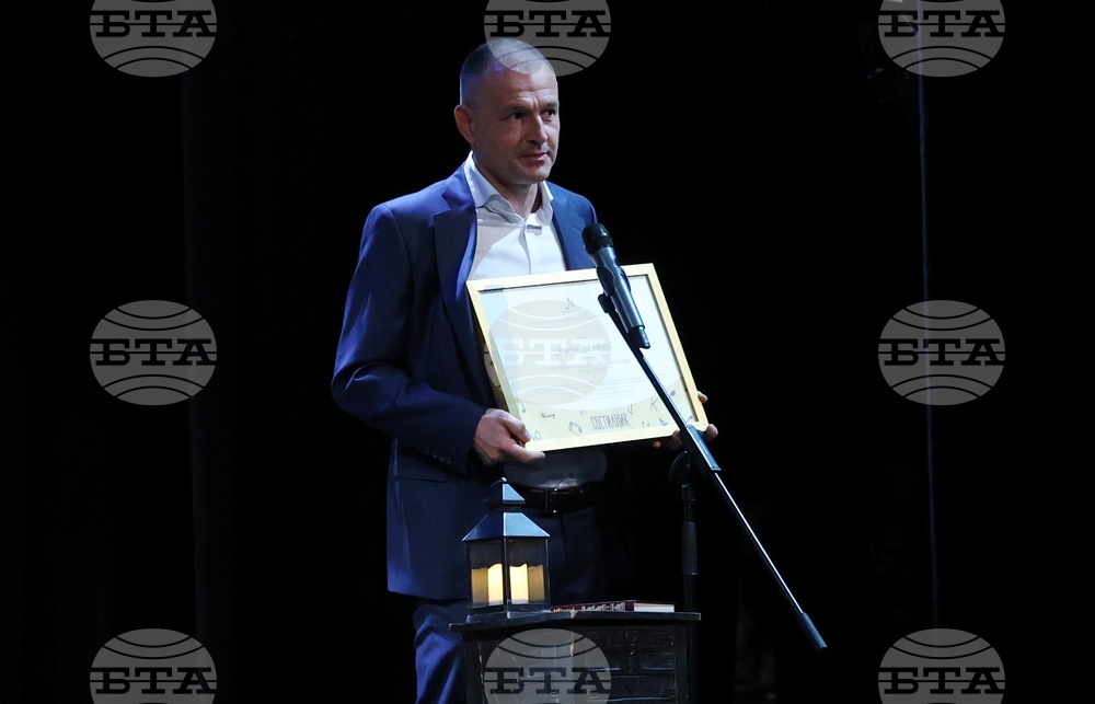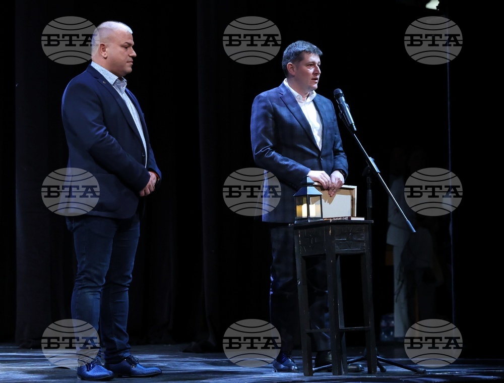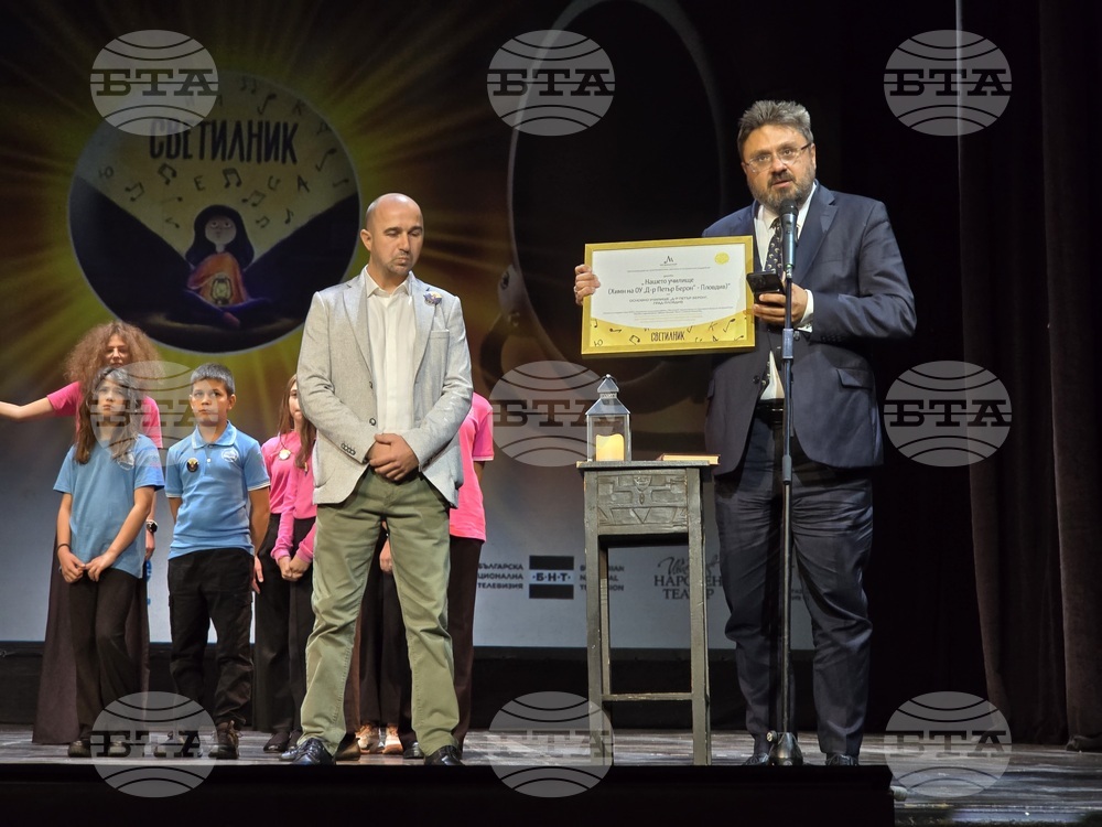 София (4 октомври 2025) В Народния театър „Иван Вазов“ се провежда тържествен концерт по случай четвъртото издание на националната инициатива „Светилник 2024/2025: Музика – лъчи!“. На снимката: генералният директор на БТА Кирил Вълчев (вдясно) връчи сертификата от четвъртото издание на "Светилник" на директорът на Основното училище "Д-р Петър Берон" в Пловдив Стефан Кичуков (вляво).