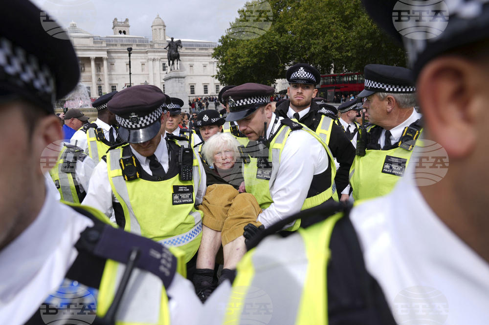 Police remove a protester taking part in a demonstration organised by Defend our Juries, in support of Palestine Action in Trafalgar Square, London Saturday Oct. 4, 2025. (Maja Smiejkowska/PA via AP)