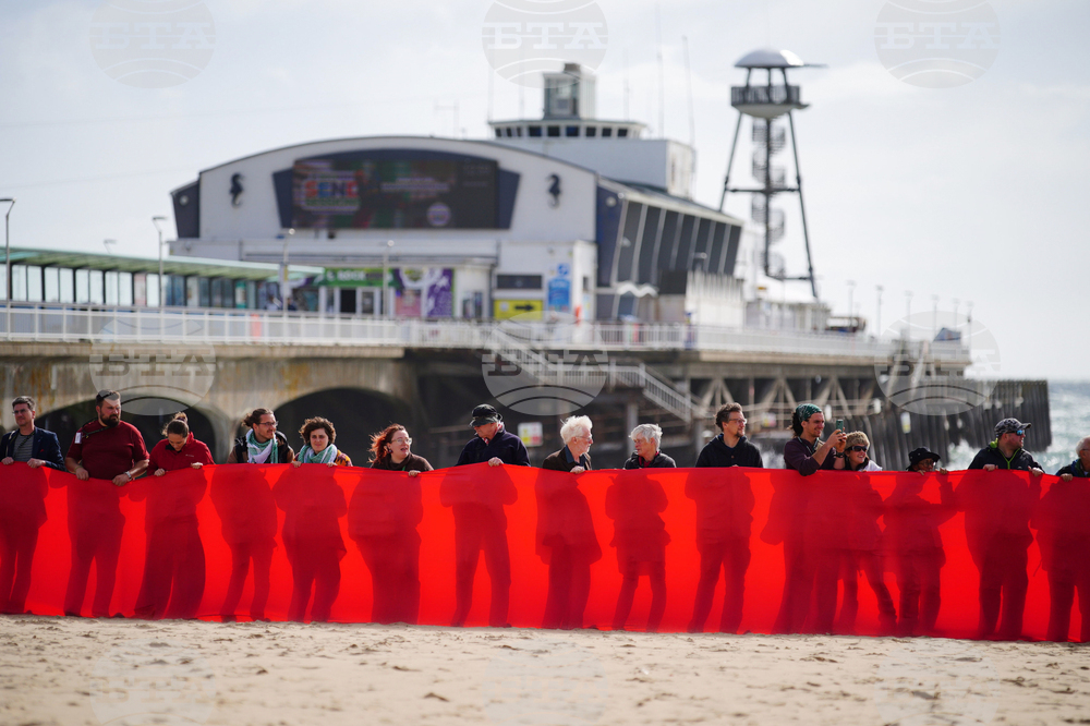 People take part in a Red Line for Gaza protest on Bournemouth beach, England, Saturday, Oct. 4 2025. (Ben Birchall/PA via AP)