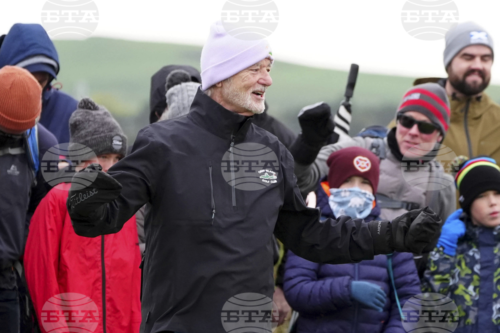 Bill Murray on the 7th tee during day three of the 2025 Alfred Dunhill Links Championship at the Old Course St. Andrews, Scotland, Saturday Oct. 4, 2025. (Jane Barlow/PA via AP)