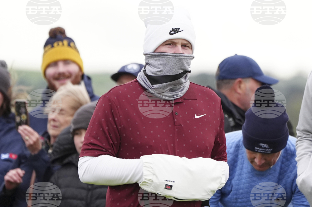 Scotland's Robert McIntyre, center left, leaves the course after play is suspended during day three of the 2025 Alfred Dunhill Links Championship at the Old Course St. Andrews, Scotland, Saturday Oct. 4, 2025. (Jane Barlow/PA via AP)