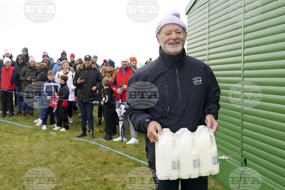 Bill Murray carries milk on day three of the 2025 Alfred Dunhill Links Championship at the Old Course St. Andrews, Scotland, Saturday Oct. 4, 2025. (Jane Barlow/PA via AP)