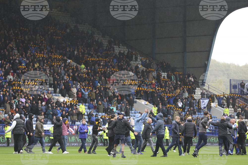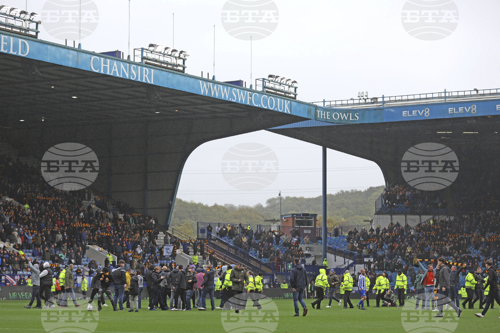 Sheffield Wednesday fans invade the pitch in protest against the club's owner Dejphon Chansiri during the Championship soccer match at Hillsborough stadium, Sheffield, England, Saturday Oct. 4, 2025. (Nigel French/PA via AP)