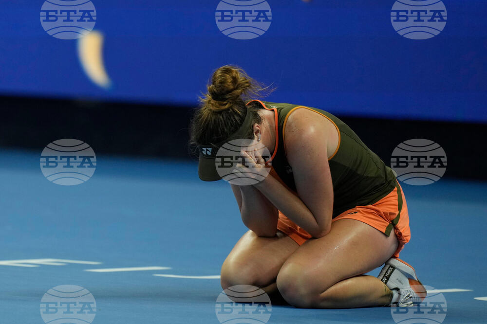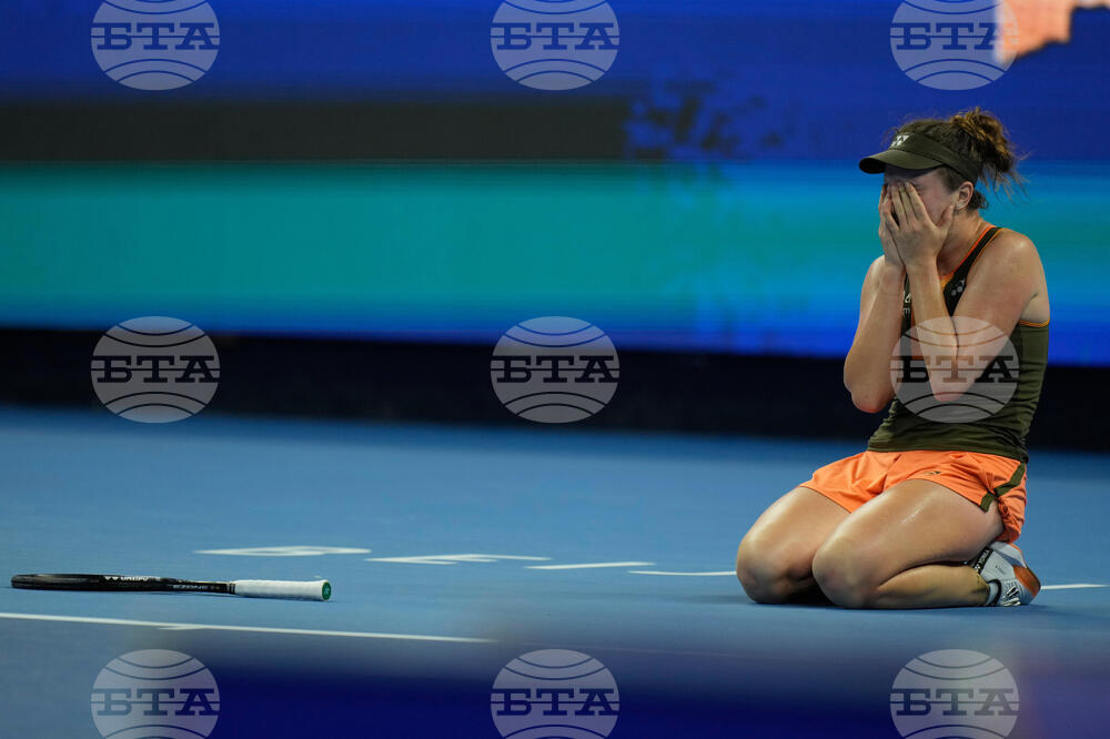 Linda Noskova, of the Czech Republic reacts after defeating Jessica Pegula, of the United States in the women's singles semifinals match of the China Open tennis tournament, at the National Tennis Center, in Beijing, Saturday, Oct. 4, 2025. (AP Photo/Andy Wong)