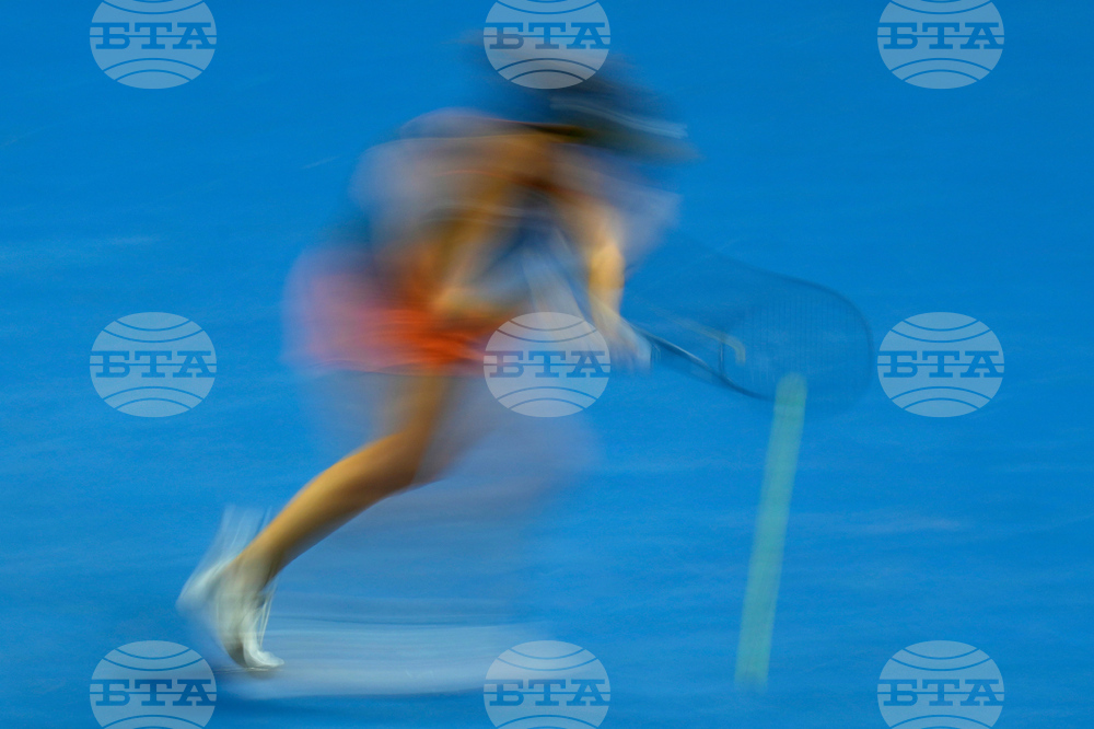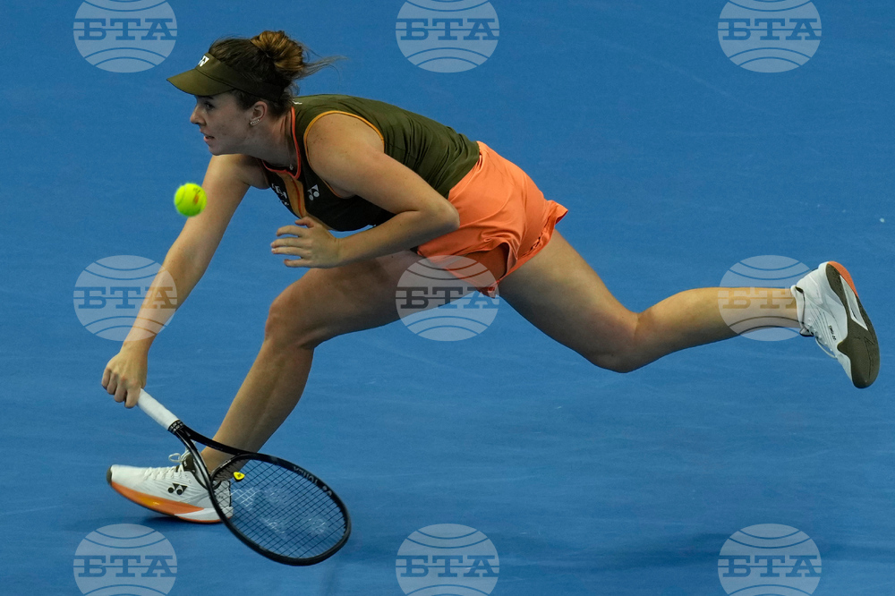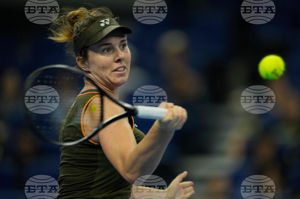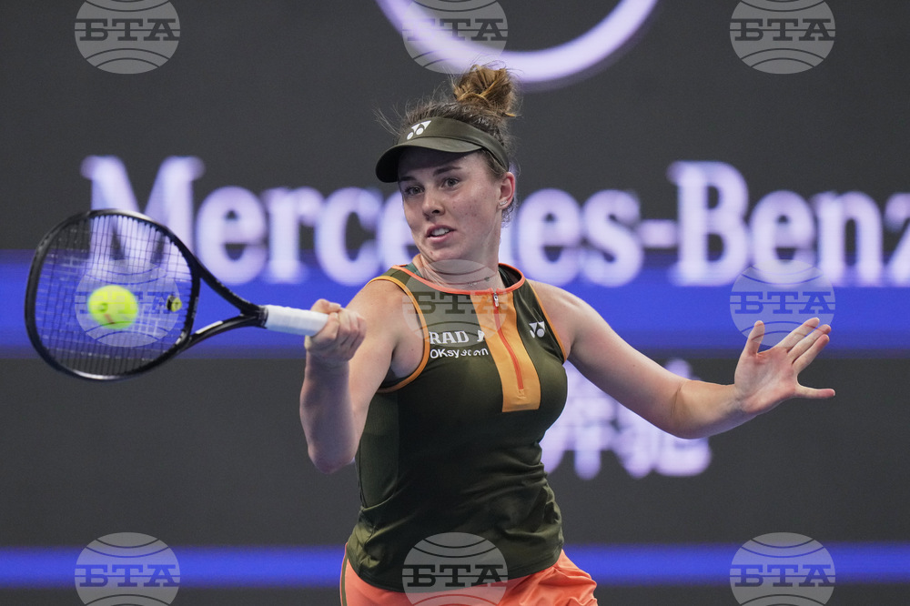 Linda Noskova, of the Czech Republic plays a backhand return rto Jessica Pegula, of the United States during the women's singles semifinals match of the China Open tennis tournament, at the National Tennis Center, in Beijing, Saturday, Oct. 4, 2025. (AP Photo/Andy Wong)