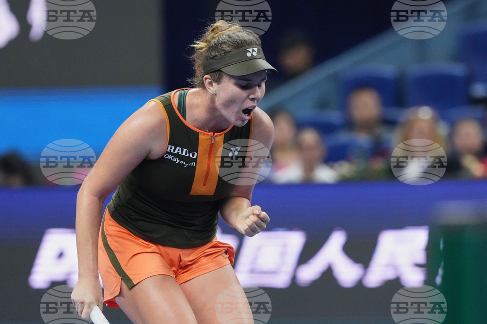Linda Noskova, of the Czech Republic reacts after scoring a break point against Jessica Pegula, of the United States during the women's singles semifinals match of the China Open tennis tournament, at the National Tennis Center, in Beijing, Saturday, Oct. 4, 2025. (AP Photo/Andy Wong)