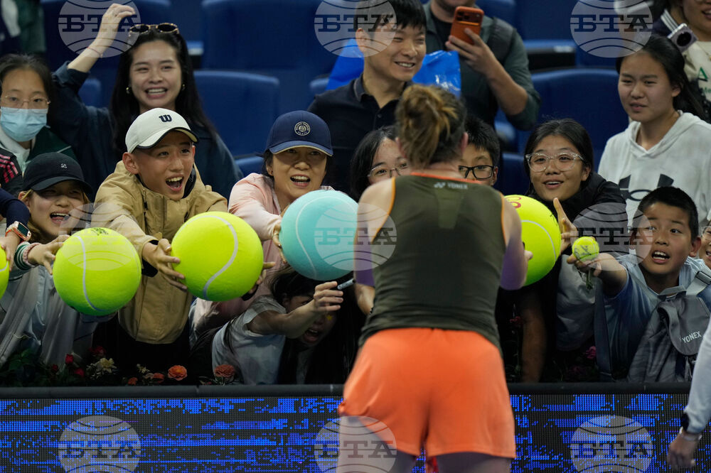 Linda Noskova of the Czech Republic signs autographs for fans after defeating Jessica Pegula of the United States in a women's singles semifinal match of the China Open tennis tournament in Beijing, China, Saturday, Oct. 4, 2025.(AP Photo/Ng Han Guan)