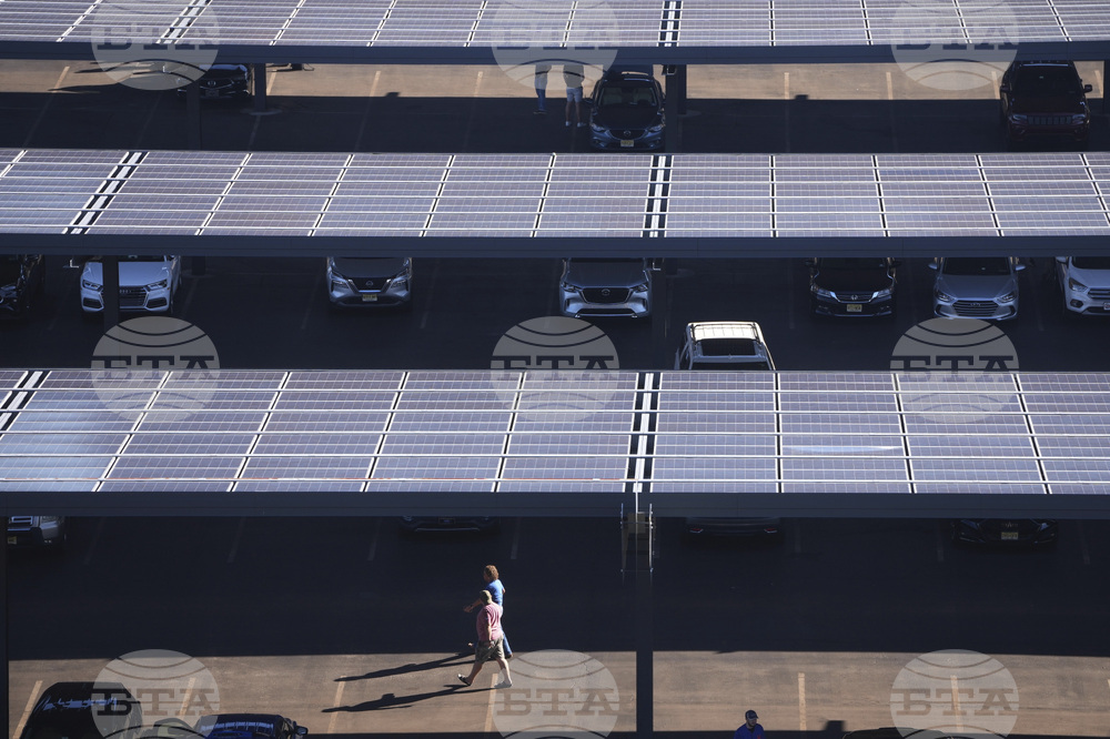 People walk though a parking lot with solar panels near Lincoln Financial Field on Monday, Sept. 8, 2025, in Philadelphia. (AP Photo/Matt Slocum)