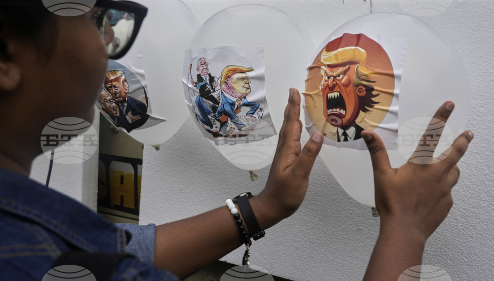 An activist fixes balloons with portraits of President Donald Trump on a truck during a rally in solidarity with the Global Sumud Flotilla after ships were intercepted by the Israeli navy, in Kolkata, India, Saturday, Oct. 4, 2025. (AP Photo/Bikas Das)