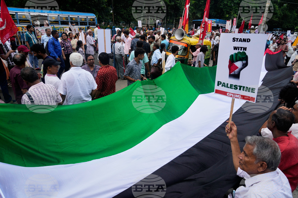 Leaders and activists of several leftist parties hold a banner with writing reading "Protest rally called by leftist parties in Kolkata, Protest against the Israeli military's attack and detention of Greta Thunberg and others on the Gaza-bound aid flotilla" during a rally in solidarity with the Global Sumud Flotilla after ships were intercepted by the Israeli navy, in Kolkata, India, Saturday, Oct. 4, 2025. (AP Photo/Bikas Das)